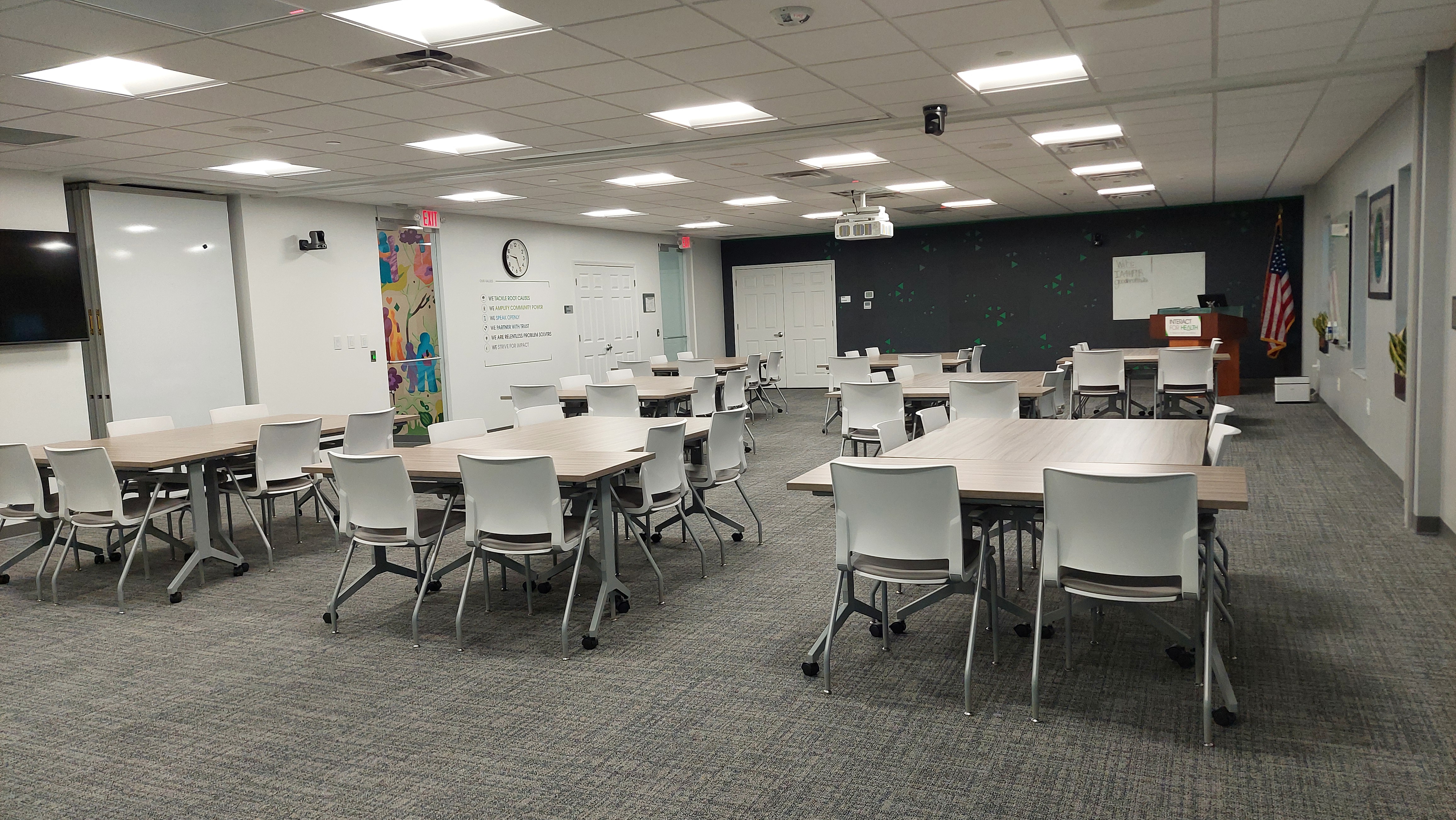 Based on availability: Monday – Wednesday, 1 pm - 4 pm; Thursday & Friday, 8:30 am – 4 pm. Requested times must include time for set up, A/V testing, and clean-up. Please do not arrive prior to the time of your reservation. Interact for Health is closed for major federal holidays (ex: New Years Day, Martin Luther King Day, Memorial Day, Juneteenth, Independence Day, Labor Day, Thanksgiving, Christmas). Please contact us to discuss other office closures. Booking requests must be made at least 10 business days before the meeting date. Organizations can book up to three (3) months in advance and one booking per month.