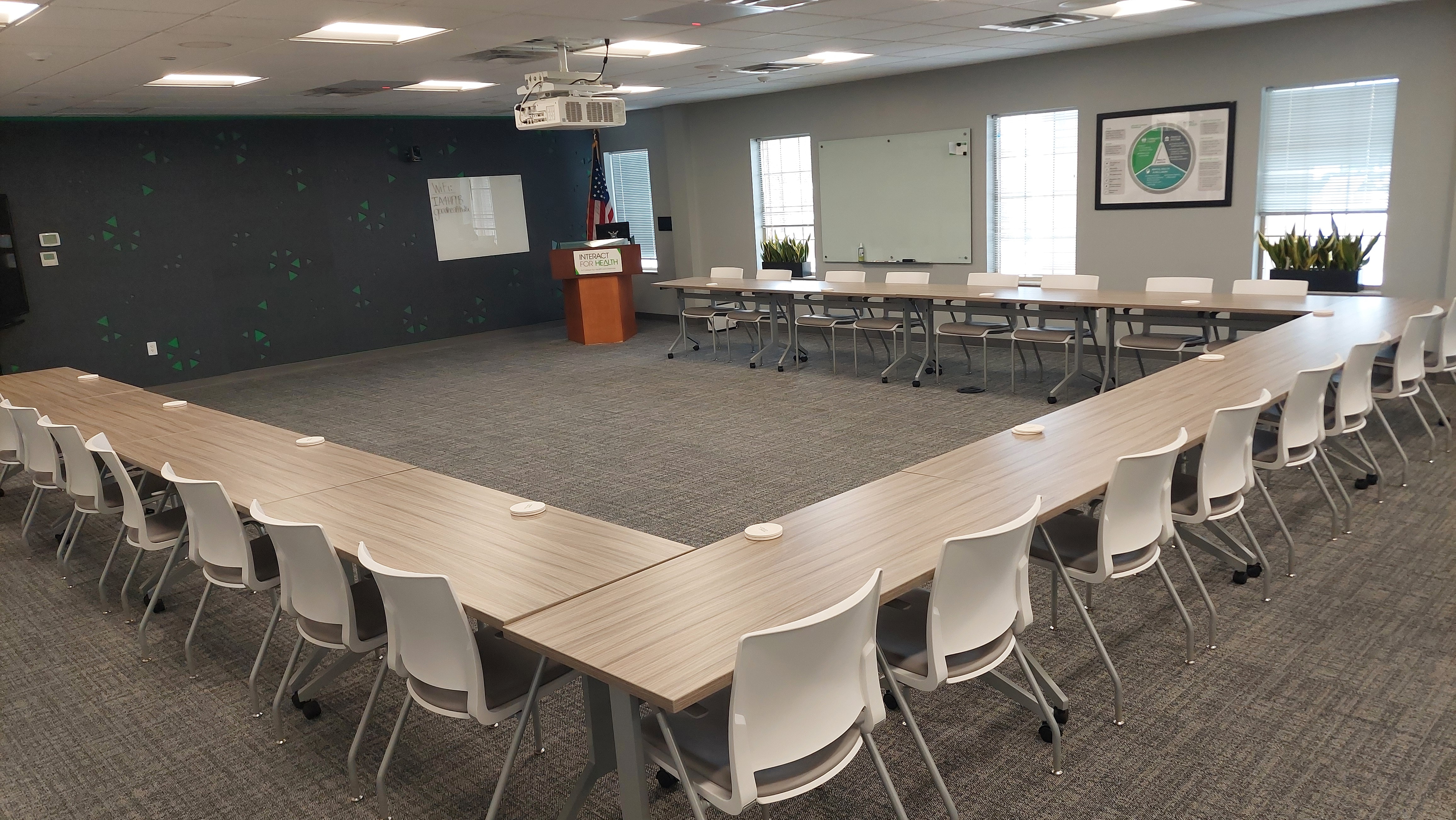 Stationary podium with HDMI laptop connection - please note, it is not compatible with Apple/MAC products. In-room PC with ceiling-mounted microphones and cameras, ceiling-mounted LCD projector, large drop-down/retractable screen. Virtual support via Zoom platform only. Two (2) white erase boards (stationary) with markers & erasers. WiFi connection. Interact for Health will not provide configuration support for external devices. Interact for Health recommends that organizations bring a backup copy of the presentation or materials on a USB drive. To maintain a safe environment, power cords must not cross a path to an exit. Attendees should utilize the outlets on the floor whenever possible or bring an external battery for their personal use. Interact for Health does not provide power strips or extension cords.